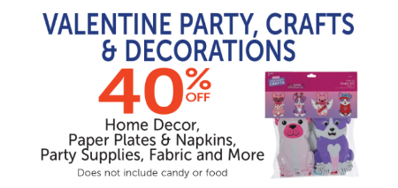 Hobby LobbyDon't miss out! Shop in store and get 40% off Valentine party, crafts and decorations, including home decor, paper plates and napkins, party supplies, fabric and more.