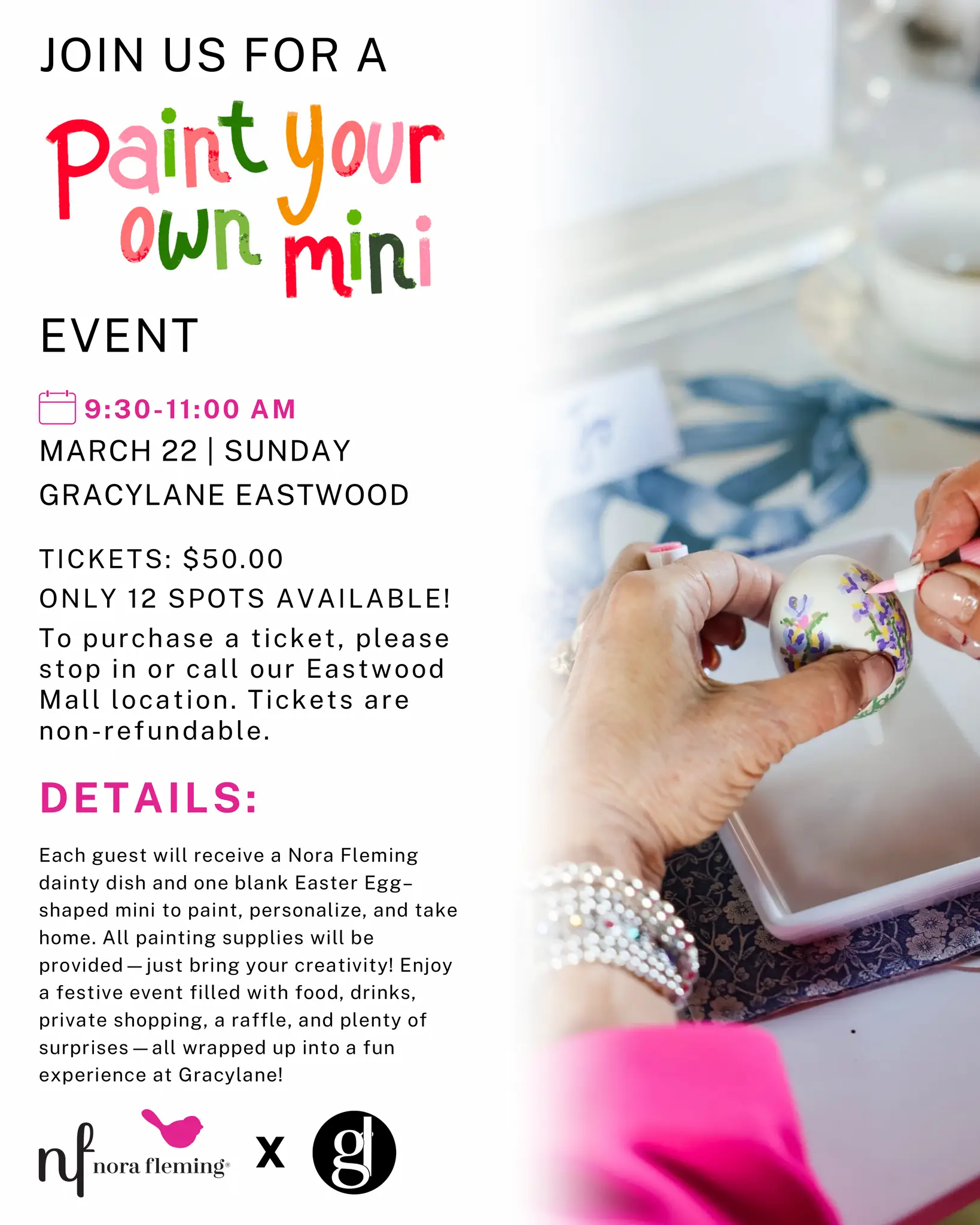 Join Gracylane for a Nora Fleming Paint Your Own Mini Event on March 22nd from 9:30am-11am. There are only 12 spots available so don't wait to reserve your space!